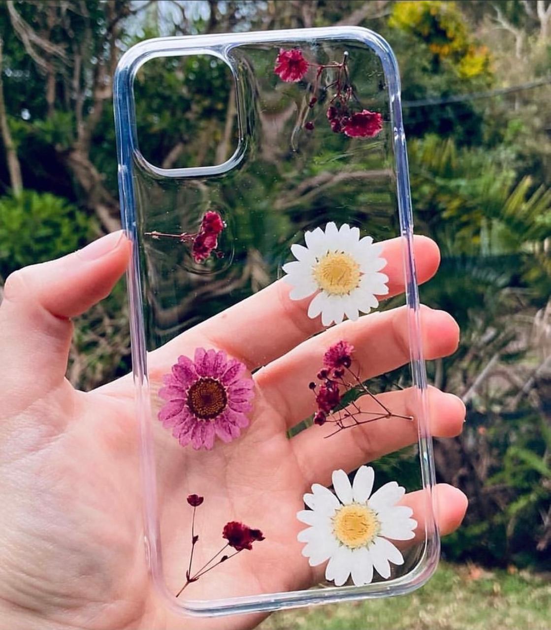 Bring nature everywhere you go with this delicate pressed-flower phone case. Featuring real dried daisies and pink blooms arranged in a soft, airy layout, this case adds a fresh, botanical touch while keeping your phone protected.
