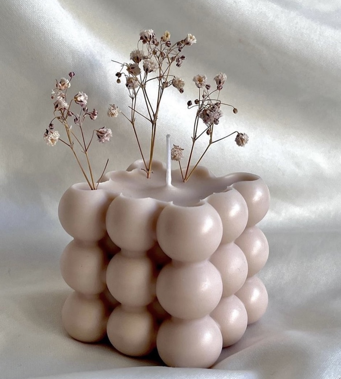 A sculptural bubble-cube candle topped with delicate dried flowers, crafted to bring a soft, elegant touch to any space. Its artistic shape makes it both a décor piece and a soothing burn. Available in various colors and scents to suit every mood and aesthetic.